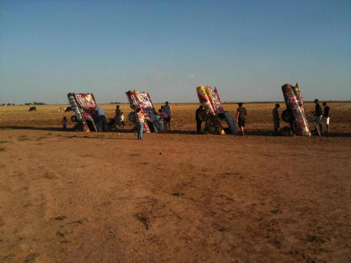 So we stopped. I'd seen pictures of the Cadillacs sticking out of the ground. They're right out in the middle of a field, with cows all around and everything. You can just walk right in.
